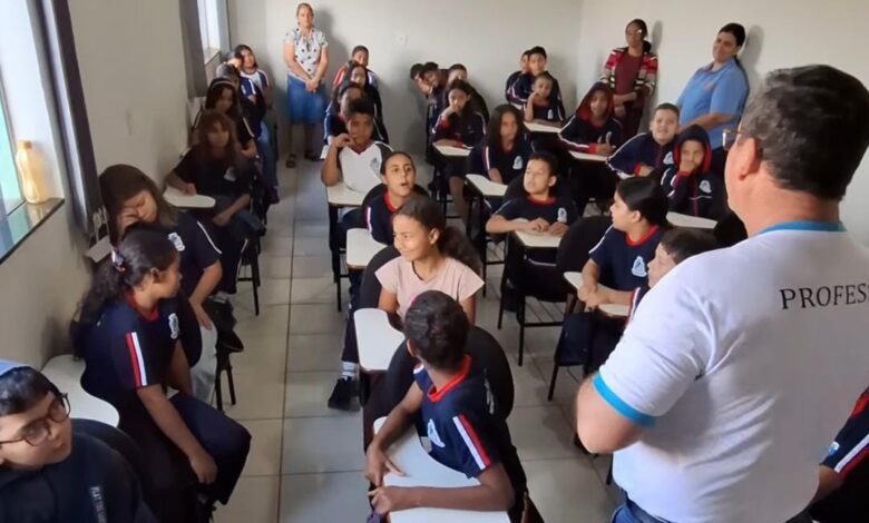 Na segunda-feira, 18 de agosto, aconteceu a primeira aula de música com os alunos do 5° período integral da Escola Municipal JK, de Serranópolis. A iniciativa é fruto de uma parceria da Secretaria de Educação com o Centro Educacional Evangélico e Assistência Social (CEEASO). As aulas serão ministradas pelo professor de música e pastor Wesley Cunha, que iniciou o projeto ensinando noções de ritmo aos alunos.