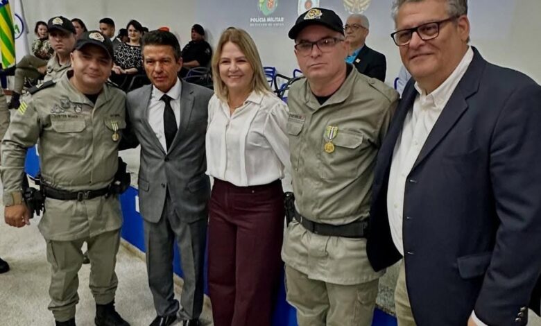Anfitrião, o prefeito Aleomar Rezende recebeu a visita de outros prefeitos, durante uma solenidade de entrega de medalhas de mérito para mais de 40 policiais militares em Mineiros. O prefeito Vinícius Terin, de Chapadão do Céu, e a prefeita Grete Elisa, de Perolândia, prestigiaram o evento.