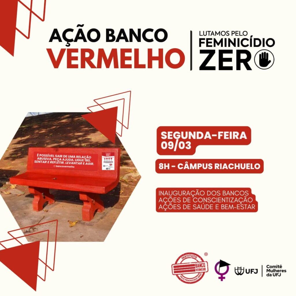 No dia 09 de março de 2026, a partir das 8h, no Câmpus Riachuelo da UFJ, realizaremos a inauguração dos bancos vermelhos com um momento especial de reflexão, conscientização e bem-estar em prol da vida das mulheres.