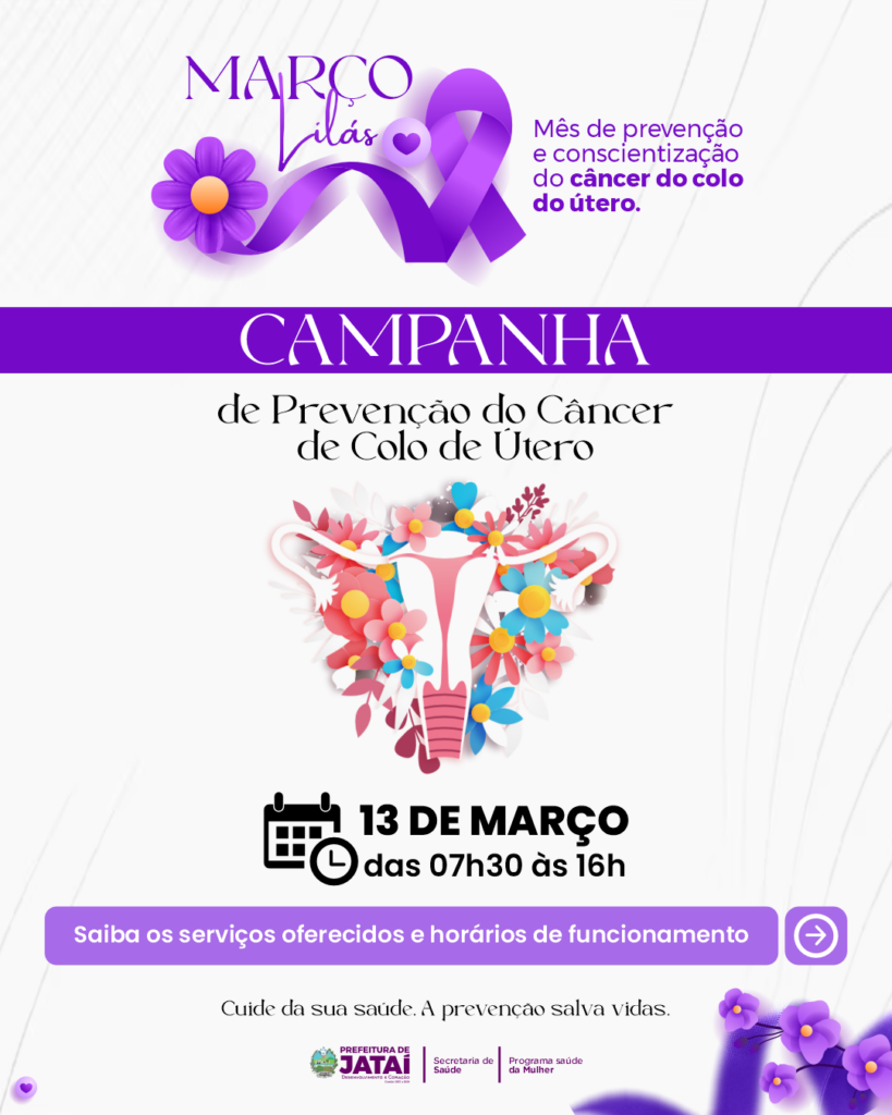 A Secretaria Municipal de Saúde de Jataí realiza, no dia 13 de março de 2026, a Campanha Março Lilás, voltada à prevenção e ao diagnóstico precoce do câncer de colo do útero.