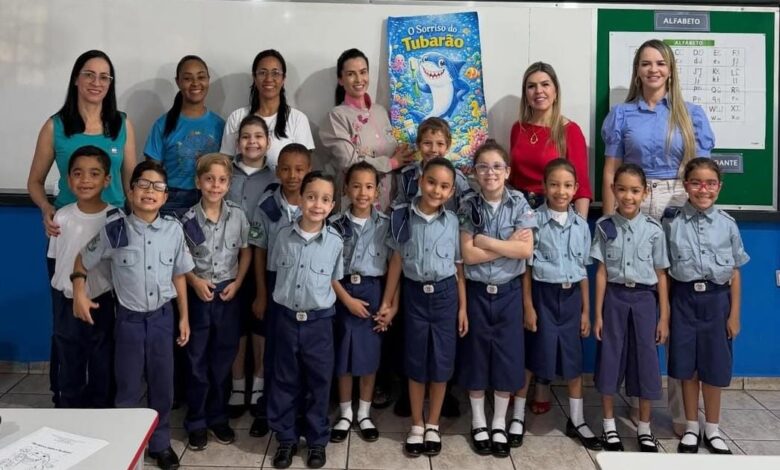 Por meio da história “O Sorriso do Tubarão”, as crianças participam de momentos educativos e lúdicos que incentivam os cuidados com os dentes e a importância da saúde bucal desde a infância.